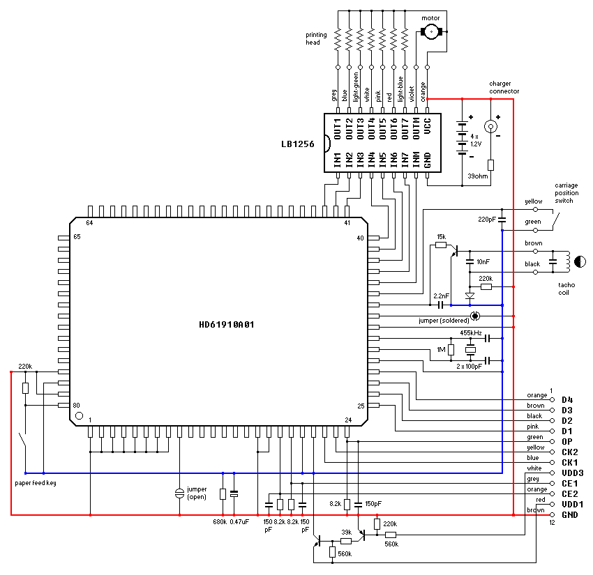 The microprocessor gets its power from the calculator (the internal rechargeable battery powers only the printing mechanism and the LB1256 driver).