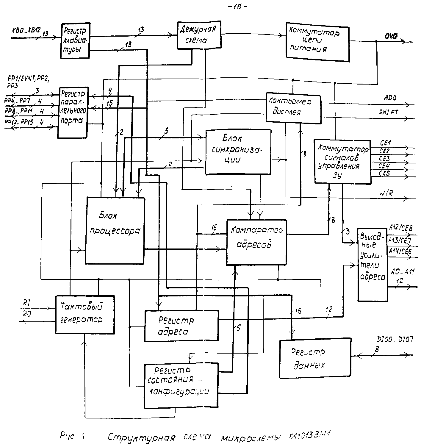 | 3 | This bit controls the direction of the bi-directional port's group of pins PP15-PP12 (inputs when set). In the Elektronika MK-85 they switch the RC timing constant of the clock oscillator circuit. Setting this bit selects fast CPU clock. |